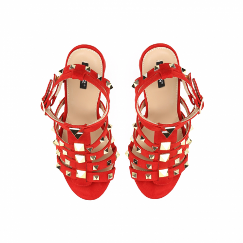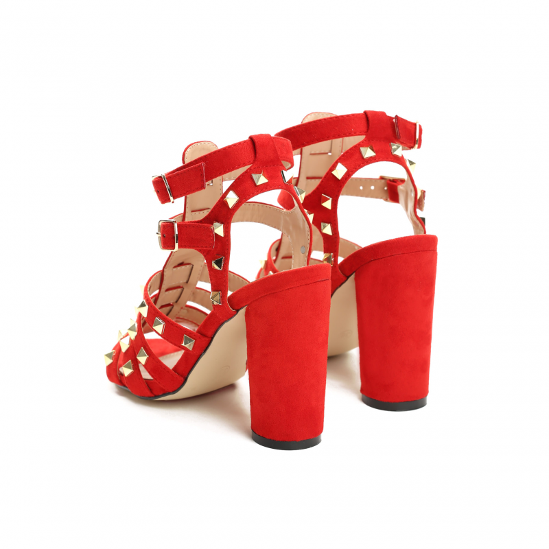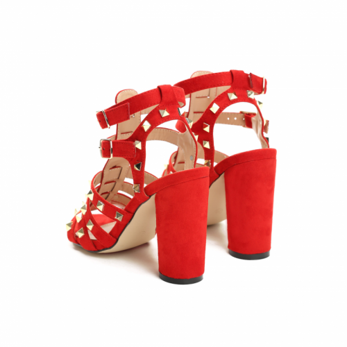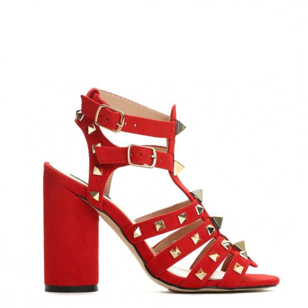 Extravagantní sandálky na vysokém kvádrovém podpatku jsou botky pro mnoho příležitostí. Tyto sandále vynikají silným podpatkem a jemnými pásky přes nárt a okolo kotníku, na kterých jsou zlaté kovové pyramidky. Tyto sandále nejlépe vyniknou při nošení spolu se sukní či šaty, ovšem skvěle budou ladit i k moderním kalhotám nad kotníky.