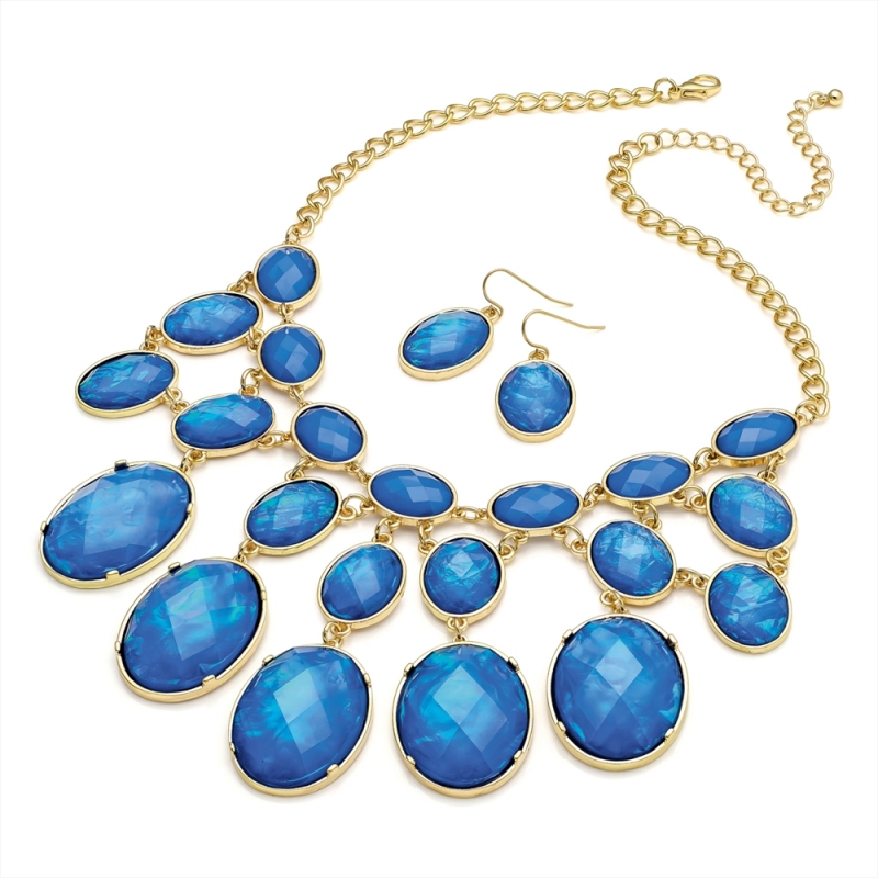 Délka náhrdelníku: 43 cm. Výška přívěsku: 9 cm. Velikost náušnic: 2,5 cm. Bižuterie.